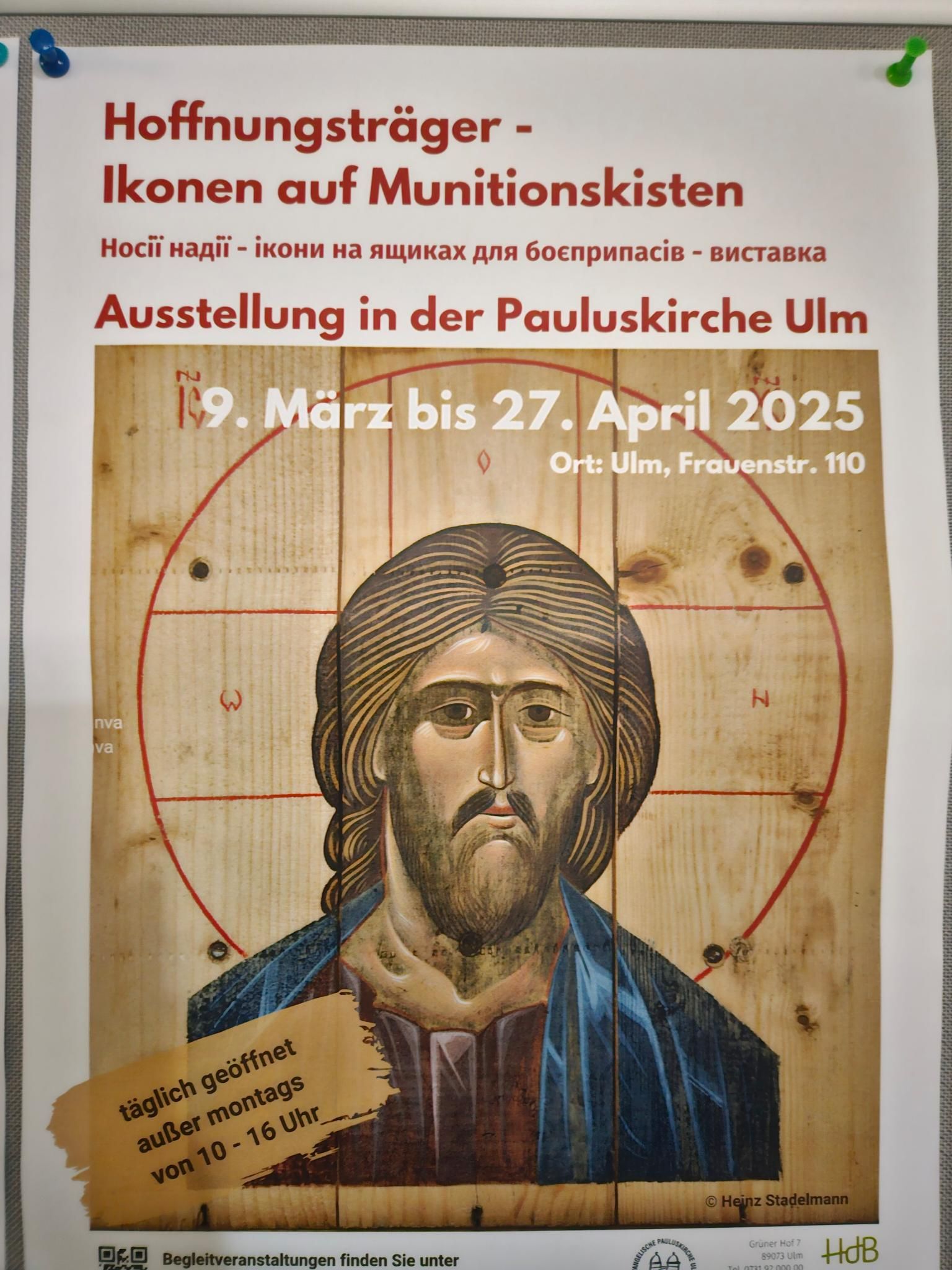 Von Sonntag, 09. März bis Sonntag, 27. April 2025 war die Ikonenausstellung unter dem Titel "Hoffnungsträger – Ikonen auf Munitionskisten" in der Pauluskirche Ulm zu sehen.